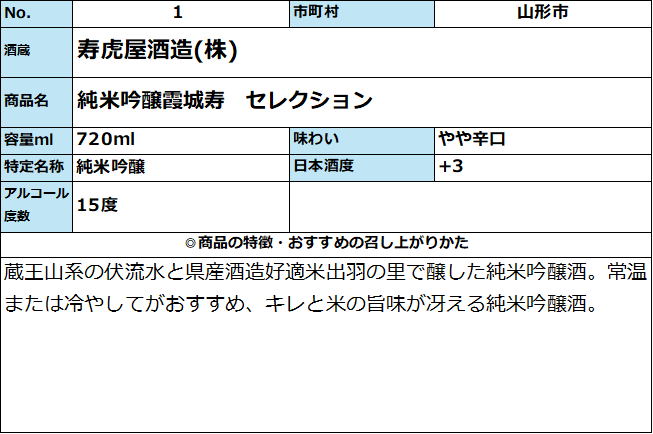 【寿虎屋酒造】 純米吟醸 霞城寿セレクション 720ml 日頃、山形県産酒をご愛飲いただいている皆様へ感謝の気持ちを込めて、抽選で40名様にプレゼントいたします。(各賞20名ずつ)●A賞 「山形讃香」720ml 1本●B賞 「山形県産ワイン」フルボトル2本対象商品を1本ご購入で「キャンペーン応募はがき」を1枚進呈。必要事項をご記入しご応募ください。※はがきのQRコードからも応募できます。◆応募受付締切:2026年1月31日(土)迄当選発表は厳正な抽選の上、当選者を決定し商品の発送をもって発表にかえさせていただきます。 販売価格 1,760円(税込み) 会員価格 (税込み) 通常価格 (税込み) 在庫 商品コード 420106 JANコード 数量 - + カートに入れる カテゴリー 清酒 メーカー 寿虎屋酒造株式会社 キャンペーン 【特設】ご愛飲感謝キャンペーン| おすすめ商品 注文年齢制限 20歳 ~ 注文手続き画面にて、生年月日を入力いただきます。 販売期間 ~2025/11/28 RECOMMENDEDおすすめアイテム 霞城寿 純米大吟醸「雪女神」 720ml 5,500円(税込み) 山形酒通のおすすめ 【特設】ご愛飲感謝キャンペーン お歳暮-感謝の気持ちを- 山形酒通厳選 セット商品 おすすめ商品 数量限定商品 秋上がり・ひやおろし 県産新酒ワイン 居酒屋気分ワンカップ リキュール・梅酒特集 産直 厳選グルメ特集 パインサイダー 県内飲料 雑貨 お中元-感謝の気持ちを- 夏酒 2025 ご注文方法 送料・配送について お支払い方法 返金について 特定商取引に基づく表記 お問い合わせ 運営会社のご紹介