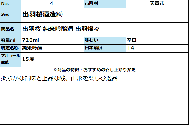 【出羽桜酒造】出羽桜 純米吟醸酒 出羽燦々 720ml 日頃、山形県産酒をご愛飲いただいている皆様へ感謝の気持ちを込めて、抽選で40名様にプレゼントいたします。(各賞20名ずつ)●A賞 「山形讃香」720ml 1本●B賞 「山形県産ワイン」フルボトル2本対象商品を1本ご購入で「キャンペーン応募はがき」を1枚進呈。必要事項をご記入しご応募ください。※はがきのQRコードからも応募できます。◆応募受付締切:2026年1月31日(土)迄当選発表は厳正な抽選の上、当選者を決定し商品の発送をもって発表にかえさせていただきます。 販売価格 1,826円(税込み) 会員価格 (税込み) 通常価格 (税込み) 在庫 商品コード 420507 JANコード 数量 - + カートに入れる カテゴリー 清酒 メーカー 出羽桜酒造株式会社 キャンペーン 【特設】ご愛飲感謝キャンペーン| おすすめ商品 注文年齢制限 20歳 ~ 注文手続き画面にて、生年月日を入力いただきます。 販売期間 ~2025/11/28 RECOMMENDEDおすすめアイテム 【出羽桜酒造】出羽桜 吟醸・辛口セット 720ml×2 3,300円(税込み) 出羽桜 吟醸 缶 180ml 484円(税込み) 出羽桜 純米酒 出羽の里 720ml 1,595円(税込み) 出羽桜 純米吟醸酒 出羽燦々 本生 720ml【要冷蔵】 1,936円(税込み) 出羽桜 特別純米酒 一耕 720ml 1,595円(税込み) 出羽桜 桜花吟醸酒 本生 720ml【要冷蔵】 1,771円(税込み) 出羽桜 桜花吟醸酒 720ml 1,650円(税込み) 出羽桜 特別純米酒 缶 180ml 440円(税込み) 【IWC2021大吟醸の部 金賞受賞!】出羽桜 大吟醸酒 720ml(カートン入) 4,400円(税込み) 出羽桜酒造 出羽桜飲み比べセット 300ml×5本 3,520円(税込み) 出羽桜酒造 出羽桜 純米吟醸・吟醸セット 720ml×2本 3,630円(税込み) 山形酒通のおすすめ 【特設】ご愛飲感謝キャンペーン お歳暮-感謝の気持ちを- 山形酒通厳選 セット商品 おすすめ商品 数量限定商品 秋上がり・ひやおろし 県産新酒ワイン 居酒屋気分ワンカップ リキュール・梅酒特集 産直 厳選グルメ特集 パインサイダー 県内飲料 雑貨 お中元-感謝の気持ちを- 夏酒 2025 ご注文方法 送料・配送について お支払い方法 返金について 特定商取引に基づく表記 お問い合わせ 運営会社のご紹介