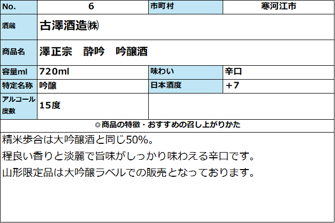 【古澤酒造】澤正宗 酔吟 吟醸酒 720ml 日頃、山形県産酒をご愛飲いただいている皆様へ感謝の気持ちを込めて、抽選で40名様にプレゼントいたします。(各賞20名ずつ)●A賞 「山形讃香」720ml 1本●B賞 「山形県産ワイン」フルボトル2本対象商品を1本ご購入で「キャンペーン応募はがき」を1枚進呈。必要事項をご記入しご応募ください。※はがきのQRコードからも応募できます。◆応募受付締切:2026年1月31日(土)迄当選発表は厳正な抽選の上、当選者を決定し商品の発送をもって発表にかえさせていただきます。 販売価格 1,870円(税込み) 会員価格 (税込み) 通常価格 (税込み) 在庫 商品コード 020808 JANコード 数量 - + カートに入れる カテゴリー 清酒 メーカー 古澤酒造株式会社 キャンペーン 【特設】ご愛飲感謝キャンペーン| おすすめ商品 注文年齢制限 20歳 ~ 注文手続き画面にて、生年月日を入力いただきます。 販売期間 ~2025/11/28 RECOMMENDEDおすすめアイテム 【古澤酒造】雪原 山形米焼酎『つや姫・雪若丸』セット 720ml×2本 4,609円(税込み) ★純米大吟醸 山形讃香しずく取り(澤正宗) 720ml【クール便発送】 11,000円(税込み) 澤正宗 純米酒 カップ 200ml 440円(税込み) 澤正宗 ヤングカップ 200ml 418円(税込み) 澤正宗 純米大吟醸 紅花屋重兵衛 雪女神 720ml 3,850円(税込み) 澤正宗 酔吟 純米吟醸 720ml 1,650円(税込み) 澤正宗 おもしろ倶楽部 山形の梅酒 500ml 1,320円(税込み) 澤正宗 おもしろ倶楽部 山形のしそ梅酒 500ml 1,320円(税込み) 古澤酒造 雪原 極上米焼酎とそば焼酎セット(720ml×2本) 4,356円(税込み) 【古澤酒造】雪原 山形米焼酎つや姫(カートン入) 720ml 2,244円(税込み) 澤正宗 純米吟醸出羽の里 山形セレクション認定 720ml 1,705円(税込み) 雪原 そば焼酎 720ml 2,145円(税込み) 【古澤酒造】雪原 山形米焼酎つや姫 720ml 1,980円(税込み) 澤正宗 吟醸出羽の里 720ml 1,430円(税込み) 山形酒通のおすすめ 【特設】ご愛飲感謝キャンペーン お歳暮-感謝の気持ちを- 山形酒通厳選 セット商品 おすすめ商品 数量限定商品 秋上がり・ひやおろし 県産新酒ワイン 居酒屋気分ワンカップ リキュール・梅酒特集 産直 厳選グルメ特集 パインサイダー 県内飲料 雑貨 お中元-感謝の気持ちを- 夏酒 2025 ご注文方法 送料・配送について お支払い方法 返金について 特定商取引に基づく表記 お問い合わせ 運営会社のご紹介