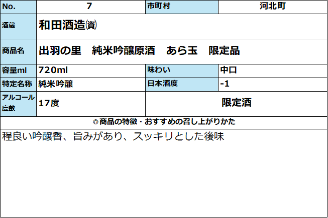 【和田酒造】出羽の里 純米吟醸原酒 あら玉限定品 720ml 日頃、山形県産酒をご愛飲いただいている皆様へ感謝の気持ちを込めて、抽選で40名様にプレゼントいたします。(各賞20名ずつ)●A賞 「山形讃香」720ml 1本●B賞 「山形県産ワイン」フルボトル2本対象商品を1本ご購入で「キャンペーン応募はがき」を1枚進呈。必要事項をご記入しご応募ください。※はがきのQRコードからも応募できます。◆応募受付締切:2026年1月31日(土)迄当選発表は厳正な抽選の上、当選者を決定し商品の発送をもって発表にかえさせていただきます。 販売価格 1,870円(税込み) 会員価格 (税込み) 通常価格 (税込み) 在庫 商品コード 410969 JANコード 数量 - + カートに入れる カテゴリー 清酒 メーカー 和田酒造合資会社 キャンペーン 【特設】ご愛飲感謝キャンペーン| おすすめ商品 注文年齢制限 20歳 ~ 注文手続き画面にて、生年月日を入力いただきます。 販売期間 ~2025/11/28 RECOMMENDEDおすすめアイテム 【和田酒造】あら玉 大吟醸 月山丸 720ml 5,500円(税込み) あら玉 特別純米 本造り原酒 谷地男 720ml(箱入り) 1,870円(税込み) 和田酒造 あら玉 飲み比べセット 300ml×5本+お猪口2個付き! 4,180円(税込み) あら玉 激辛口 三年熟成本醸造原酒 鬼王丸(赤) 720ml 1,430円(税込み) あら玉 1999年醸造 特別純米 玉彦 720ml 3,465円(税込み) 改良信交 純米大吟醸 あら玉 720ml 3,245円(税込み) 改良信交 特別純米 あら玉 720ml 1,430円(税込み) あら玉 超辛口 純米酒 鬼王丸(青)720ml 1,320円(税込み) 山形酒通のおすすめ 【特設】ご愛飲感謝キャンペーン お歳暮-感謝の気持ちを- 山形酒通厳選 セット商品 おすすめ商品 数量限定商品 秋上がり・ひやおろし 県産新酒ワイン 居酒屋気分ワンカップ リキュール・梅酒特集 産直 厳選グルメ特集 パインサイダー 県内飲料 雑貨 お中元-感謝の気持ちを- 夏酒 2025 ご注文方法 送料・配送について お支払い方法 返金について 特定商取引に基づく表記 お問い合わせ 運営会社のご紹介