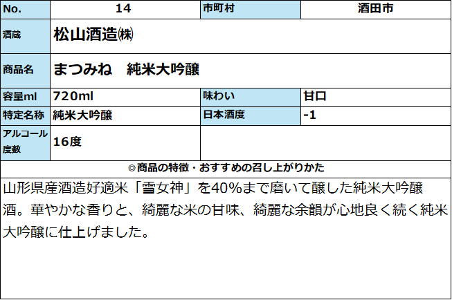 【松山酒造】まつみね 純米大吟醸 720ml 日頃、山形県産酒をご愛飲いただいている皆様へ感謝の気持ちを込めて、抽選で40名様にプレゼントいたします。(各賞20名ずつ)●A賞 「山形讃香」720ml 1本●B賞 「山形県産ワイン」フルボトル2本対象商品を1本ご購入で「キャンペーン応募はがき」を1枚進呈。必要事項をご記入しご応募ください。※はがきのQRコードからも応募できます。◆応募受付締切:2026年1月31日(土)迄当選発表は厳正な抽選の上、当選者を決定し商品の発送をもって発表にかえさせていただきます。 販売価格 2,750円(税込み) 会員価格 (税込み) 通常価格 (税込み) 在庫 商品コード 022551 JANコード 数量 - + カートに入れる カテゴリー 清酒 メーカー 松山酒造株式会社 キャンペーン 【特設】ご愛飲感謝キャンペーン| おすすめ商品 注文年齢制限 20歳 ~ 注文手続き画面にて、生年月日を入力いただきます。 販売期間 ~2025/11/28 山形酒通のおすすめ 【特設】ご愛飲感謝キャンペーン お歳暮-感謝の気持ちを- 山形酒通厳選 セット商品 おすすめ商品 数量限定商品 秋上がり・ひやおろし 県産新酒ワイン 居酒屋気分ワンカップ リキュール・梅酒特集 産直 厳選グルメ特集 パインサイダー 県内飲料 雑貨 お中元-感謝の気持ちを- 夏酒 2025 ご注文方法 送料・配送について お支払い方法 返金について 特定商取引に基づく表記 お問い合わせ 運営会社のご紹介