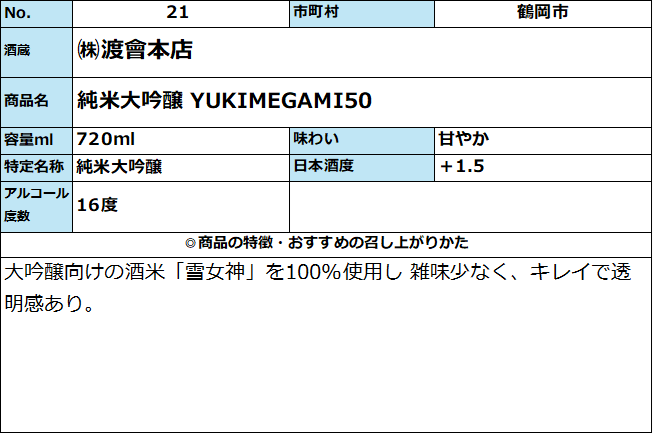 【渡會本店】純米大吟醸 YUKIMEGAMI50 720ml 日頃、山形県産酒をご愛飲いただいている皆様へ感謝の気持ちを込めて、抽選で40名様にプレゼントいたします。(各賞20名ずつ)●A賞 「山形讃香」720ml 1本●B賞 「山形県産ワイン」フルボトル2本対象商品を1本ご購入で「キャンペーン応募はがき」を1枚進呈。必要事項をご記入しご応募ください。※はがきのQRコードからも応募できます。◆応募受付締切:2026年1月31日(土)迄当選発表は厳正な抽選の上、当選者を決定し商品の発送をもって発表にかえさせていただきます。 販売価格 2,200円(税込み) 会員価格 (税込み) 通常価格 (税込み) 在庫 商品コード 424047 JANコード 数量 - + カートに入れる カテゴリー 清酒 メーカー 株式会社渡會本店 キャンペーン 【特設】ご愛飲感謝キャンペーン| おすすめ商品 注文年齢制限 20歳 ~ 注文手続き画面にて、生年月日を入力いただきます。 販売期間 ~2025/11/28 RECOMMENDEDおすすめアイテム 出羽ノ雪 普通酒 カップ 180ml 275円(税込み) 出羽ノ雪 純米吟醸・特別純米 夏セット 720ml×2本 4,180円(税込み) 出羽ノ雪 純米大吟醸 雪女神仕込み 720ml 3,168円(税込み) 出羽ノ雪 IGO(イ号) 特別純米酒 720ml 1,650円(税込み) 山形酒通のおすすめ 【特設】ご愛飲感謝キャンペーン お歳暮-感謝の気持ちを- 山形酒通厳選 セット商品 おすすめ商品 数量限定商品 秋上がり・ひやおろし 県産新酒ワイン 居酒屋気分ワンカップ リキュール・梅酒特集 産直 厳選グルメ特集 パインサイダー 県内飲料 雑貨 お中元-感謝の気持ちを- 夏酒 2025 ご注文方法 送料・配送について お支払い方法 返金について 特定商取引に基づく表記 お問い合わせ 運営会社のご紹介