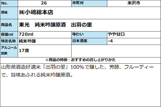【小嶋総本店】東光 純米吟醸原酒 出羽の里 720ml 日頃、山形県産酒をご愛飲いただいている皆様へ感謝の気持ちを込めて、抽選で40名様にプレゼントいたします。(各賞20名ずつ)●A賞 「山形讃香」720ml 1本●B賞 「山形県産ワイン」フルボトル2本対象商品を1本ご購入で「キャンペーン応募はがき」を1枚進呈。必要事項をご記入しご応募ください。※はがきのQRコードからも応募できます。◆応募受付締切:2026年1月31日(土)迄当選発表は厳正な抽選の上、当選者を決定し商品の発送をもって発表にかえさせていただきます。 販売価格 1,694円(税込み) 会員価格 (税込み) 通常価格 (税込み) 在庫 商品コード 015361 JANコード 数量 - + カートに入れる カテゴリー 清酒 メーカー 株式会社小嶋総本店 キャンペーン 【特設】ご愛飲感謝キャンペーン| おすすめ商品 注文年齢制限 20歳 ~ 注文手続き画面にて、生年月日を入力いただきます。 販売期間 ~2025/11/28 RECOMMENDEDおすすめアイテム 【小嶋総本店】東光 純米大吟醸 雪女神 720ml 3,850円(税込み) 小嶋総本店 東光 純米大吟醸 雪女神 720ml 3,850円(税込み) 東光 超辛口純米吟醸 720ml 1,496円(税込み) 東光 純米大吟醸 山田錦 720ml 3,850円(税込み) 東光 純米大吟醸 左きき 720ml 3,300円(税込み) 東光 花の慶次 純米吟醸 720ml 2,640円(税込み) 東光 辛口純米大吟醸 720ml 1,980円(税込み) 東光 純米 720ml 1,298円(税込み) 東光 純米吟醸原酒 アルミ缶 180ml 473円(税込み) 【10月11日発売】東光 純米大吟醸 袋吊り 十八(箱入り)720ml 13,200円(税込み) 山形酒通のおすすめ 【特設】ご愛飲感謝キャンペーン お歳暮-感謝の気持ちを- 山形酒通厳選 セット商品 おすすめ商品 数量限定商品 秋上がり・ひやおろし 県産新酒ワイン 居酒屋気分ワンカップ リキュール・梅酒特集 産直 厳選グルメ特集 パインサイダー 県内飲料 雑貨 お中元-感謝の気持ちを- 夏酒 2025 ご注文方法 送料・配送について お支払い方法 返金について 特定商取引に基づく表記 お問い合わせ 運営会社のご紹介