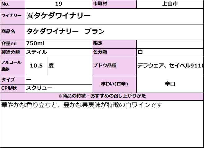 【タケダワイナリー】ブラン 750ml 日頃、山形県産酒をご愛飲いただいている皆様へ感謝の気持ちを込めて、抽選で40名様にプレゼントいたします。(各賞20名ずつ)●A賞 「山形讃香」720ml 1本●B賞 「山形県産ワイン」フルボトル2本対象商品を1本ご購入で「キャンペーン応募はがき」を1枚進呈。必要事項をご記入しご応募ください。※はがきのQRコードからも応募できます。◆応募受付締切:2026年1月31日(土)迄当選発表は厳正な抽選の上、当選者を決定し商品の発送をもって発表にかえさせていただきます。 販売価格 1,980円(税込み) 会員価格 (税込み) 通常価格 (税込み) 在庫 商品コード 498042 JANコード 数量 - + カートに入れる カテゴリー 果実酒 メーカー 有限会社タケダワイナリー キャンペーン 【特設】ご愛飲感謝キャンペーン| おすすめ商品 注文年齢制限 20歳 ~ 注文手続き画面にて、生年月日を入力いただきます。 販売期間 ~2025/11/28 RECOMMENDEDおすすめアイテム 【タケダワイナリー】ルージュ 750ml 1,980円(税込み) 【タケダワイナリー】クリオエクストラクシオン ナイアガラ 750ml 2,420円(税込み) タケダワイナリー ブラン・ルージュセット 各750ml×1 4,290円(税込み) タケダワイナリー ブラン 白(辛口)720ml 1,980円(税込み) タケダワイナリー ルージュ 赤(辛口)720ml 1,980円(税込み) 山形酒通のおすすめ 【特設】ご愛飲感謝キャンペーン お歳暮-感謝の気持ちを- 山形酒通厳選 セット商品 おすすめ商品 数量限定商品 秋上がり・ひやおろし 県産新酒ワイン 居酒屋気分ワンカップ リキュール・梅酒特集 産直 厳選グルメ特集 パインサイダー 県内飲料 雑貨 お中元-感謝の気持ちを- 夏酒 2025 ご注文方法 送料・配送について お支払い方法 返金について 特定商取引に基づく表記 お問い合わせ 運営会社のご紹介
