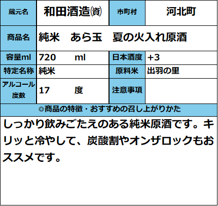 【4月22日発売】純米 あら玉 夏の火入れ原酒 720ml 販売価格 1,650円(税込み) 会員価格 (税込み) 通常価格 (税込み) 在庫 商品コード 410949 JANコード 数量 - + カートに入れる カテゴリー 清酒 メーカー 和田酒造㈾ キャンペーン 夏酒 2026| おすすめ商品 RECOMMENDEDおすすめアイテム 【イチオシ商品】あら玉 純米 改良信交 720ml 1,540円(税込み) 【4月22日発売】純米吟醸 あら玉 夏のうすにごり生酒 720ml 1,980円(税込み) 【和田酒造】あら玉 酒袋セット(つや姫300ml 1本・雪若丸300ml 1本) 2,640円(税込み) 【和田酒造】あら玉 酒袋セット(本醸造300ml 2本) 1,980円(税込み) 改良信交 特別純米 あら玉 720ml 1,540円(税込み) あら玉 超辛口 純米酒 鬼王丸(青)720ml 1,375円(税込み) あら玉 激辛口 三年熟成本醸造原酒 鬼王丸(赤) 720ml 1,540円(税込み) あら玉 1999年醸造 特別純米 玉彦 720ml 4,400円(税込み) 【和田酒造】ゆぎにごり 純米吟醸生酒ぼんだら 720ml 1,870円(税込み) 【和田酒造】純米吟醸生酒 谷地のあらばしり 720ml 1,980円(税込み) 【和田酒造】出羽の里 純米生原酒あら玉 720ml 1,650円(税込み) 【和田酒造】改良信交 純米吟醸生原酒あら玉 720ml 1,760円(税込み) 【和田酒造】本醸造生原酒 葉山おろし 720ml 1,485円(税込み) 【和田酒造】あら玉 大吟醸 月山丸 720ml 5,500円(税込み) 山形酒通のおすすめ 夏酒 2026 ★イチオシ商品 数量限定商品 お中元-感謝の気持ちを- イタリアワイン おすすめ商品 居酒屋気分ワンカップ パインサイダー 【第30回】山形の地酒 生酒頒布会 産直 厳選グルメ特集 【SALE】訳アリ商品 飲料 雑貨 【新酒】しぼりたて お歳暮-感謝の気持ちを- ご注文方法 送料・配送について お支払い方法 返金について 特定商取引に基づく表記 お問い合わせ 運営会社のご紹介