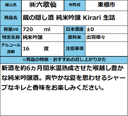 【6月3日発売】蔵の隠し酒 純米吟醸 Kirari(きらり)生詰 720ml 販売価格 2,182円(税込み) 会員価格 (税込み) 通常価格 (税込み) 在庫 商品コード 421509 JANコード 数量 - + カートに入れる カテゴリー 清酒 メーカー ㈱六歌仙 キャンペーン 夏酒 2026| おすすめ商品 RECOMMENDEDおすすめアイテム 【六歌仙】蔵の隠し酒 純米吟醸ぎゅるり生酒 720ml 2,182円(税込み) 【六歌仙】感謝ラベル 純米大吟醸 720ml 4,253円(税込み) 六歌仙 辛口 720ml 1,111円(税込み) 山形酒通のおすすめ 夏酒 2026 ★イチオシ商品 数量限定商品 お中元-感謝の気持ちを- イタリアワイン おすすめ商品 居酒屋気分ワンカップ パインサイダー 【第30回】山形の地酒 生酒頒布会 産直 厳選グルメ特集 【SALE】訳アリ商品 飲料 雑貨 【新酒】しぼりたて お歳暮-感謝の気持ちを- ご注文方法 送料・配送について お支払い方法 返金について 特定商取引に基づく表記 お問い合わせ 運営会社のご紹介