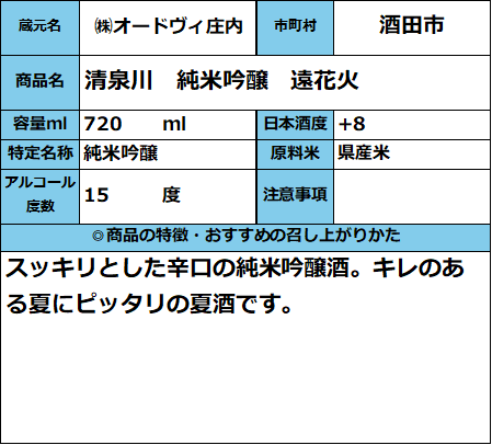 【5月初旬発売】清泉川 純米吟醸 遠花火 720ml 販売価格 1,730円(税込み) 会員価格 (税込み) 通常価格 (税込み) 在庫 商品コード 422407 JANコード 数量 - + カートに入れる カテゴリー 清酒 メーカー ㈱オードヴィ庄内 キャンペーン 夏酒 2026| おすすめ商品 RECOMMENDEDおすすめアイテム 清泉川 純米大吟醸 雪女神 720ml 3,500円(税込み) 山形酒通のおすすめ 夏酒 2026 ★イチオシ商品 数量限定商品 お中元-感謝の気持ちを- イタリアワイン おすすめ商品 居酒屋気分ワンカップ パインサイダー 【第30回】山形の地酒 生酒頒布会 産直 厳選グルメ特集 【SALE】訳アリ商品 飲料 雑貨 【新酒】しぼりたて お歳暮-感謝の気持ちを- ご注文方法 送料・配送について お支払い方法 返金について 特定商取引に基づく表記 お問い合わせ 運営会社のご紹介