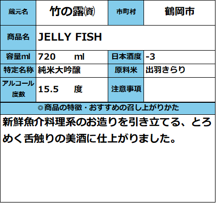 【発売中】JELLY FISH 720ml 販売価格 2,420円(税込み) 会員価格 (税込み) 通常価格 (税込み) 在庫 商品コード 013467 JANコード 数量 - + カートに入れる カテゴリー 清酒 メーカー 竹の露㈾ キャンペーン 夏酒 2026| おすすめ商品 RECOMMENDEDおすすめアイテム 竹の露 純米 720ml 1,760円(税込み) 【竹の露】純米吟醸原酒『白露垂珠』改良信交 GENESIS 720ml 2,640円(税込み) 白露垂珠 仕込み水(シリカ水)2本セット 【720ml×2本】 1,100円(税込み) 山形酒通のおすすめ 夏酒 2026 ★イチオシ商品 数量限定商品 お中元-感謝の気持ちを- イタリアワイン おすすめ商品 居酒屋気分ワンカップ パインサイダー 【第30回】山形の地酒 生酒頒布会 産直 厳選グルメ特集 【SALE】訳アリ商品 飲料 雑貨 【新酒】しぼりたて お歳暮-感謝の気持ちを- ご注文方法 送料・配送について お支払い方法 返金について 特定商取引に基づく表記 お問い合わせ 運営会社のご紹介