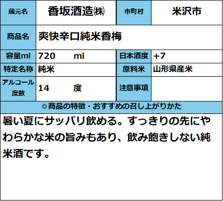 【6月1日発売】爽快辛口純米 香梅(火入れ) 720ml 販売価格 1,650円(税込み) 会員価格 (税込み) 通常価格 (税込み) 在庫 商品コード 015118 JANコード 数量 - + カートに入れる カテゴリー 清酒 メーカー 香坂酒造㈱ キャンペーン 夏酒 2026| おすすめ商品 RECOMMENDEDおすすめアイテム 【6月1日発売】夏の淡麗 大吟醸香梅(火入れ) 720ml 2,200円(税込み) 【香坂酒造】純米大吟醸生原酒 香梅限定にごり酒 720ml 2,750円(税込み) 【香坂酒造】純米大吟醸生原酒 香梅 720ml 2,750円(税込み) 【香坂酒造】純米吟醸~峻~ 直汲み 720ml 1,760円(税込み) 【香坂酒造】初しぼり純米生原酒 鷹山 720ml 1,925円(税込み) 香梅 精撰 カップ 180ml 308円(税込み) 山形酒通のおすすめ 夏酒 2026 ★イチオシ商品 数量限定商品 お中元-感謝の気持ちを- イタリアワイン おすすめ商品 居酒屋気分ワンカップ パインサイダー 【第30回】山形の地酒 生酒頒布会 産直 厳選グルメ特集 【SALE】訳アリ商品 飲料 雑貨 【新酒】しぼりたて お歳暮-感謝の気持ちを- ご注文方法 送料・配送について お支払い方法 返金について 特定商取引に基づく表記 お問い合わせ 運営会社のご紹介