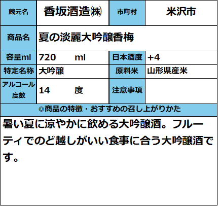 【6月1日発売】夏の淡麗 大吟醸香梅(火入れ) 720ml 販売価格 2,200円(税込み) 会員価格 (税込み) 通常価格 (税込み) 在庫 商品コード 015157 JANコード 数量 - + カートに入れる カテゴリー 清酒 メーカー 香坂酒造㈱ キャンペーン 夏酒 2026| おすすめ商品 RECOMMENDEDおすすめアイテム 【6月1日発売】爽快辛口純米 香梅(火入れ) 720ml 1,650円(税込み) 【香坂酒造】純米大吟醸生原酒 香梅限定にごり酒 720ml 2,750円(税込み) 【香坂酒造】純米大吟醸生原酒 香梅 720ml 2,750円(税込み) 【香坂酒造】純米吟醸~峻~ 直汲み 720ml 1,760円(税込み) 【香坂酒造】初しぼり純米生原酒 鷹山 720ml 1,925円(税込み) 香梅 精撰 カップ 180ml 308円(税込み) 山形酒通のおすすめ 夏酒 2026 ★イチオシ商品 数量限定商品 お中元-感謝の気持ちを- イタリアワイン おすすめ商品 居酒屋気分ワンカップ パインサイダー 【第30回】山形の地酒 生酒頒布会 産直 厳選グルメ特集 【SALE】訳アリ商品 飲料 雑貨 【新酒】しぼりたて お歳暮-感謝の気持ちを- ご注文方法 送料・配送について お支払い方法 返金について 特定商取引に基づく表記 お問い合わせ 運営会社のご紹介