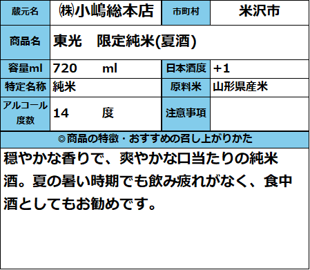 【5月11日発売】東光 限定純米(夏酒) 720ml 販売価格 1,694円(税込み) 会員価格 (税込み) 通常価格 (税込み) 在庫 商品コード 015371 JANコード 数量 - + カートに入れる カテゴリー 清酒 メーカー ㈱小嶋総本店 キャンペーン 夏酒 2026| おすすめ商品 RECOMMENDEDおすすめアイテム 東光 純米吟醸原酒 アルミ缶 180ml 539円(税込み) 小嶋総本店 東光 純米大吟醸 雪女神 720ml 3,850円(税込み) 東光 花の慶次 純米吟醸 720ml 2,640円(税込み) 東光 辛口純米大吟醸 720ml 1,980円(税込み) 山形酒通のおすすめ 夏酒 2026 ★イチオシ商品 数量限定商品 お中元-感謝の気持ちを- イタリアワイン おすすめ商品 居酒屋気分ワンカップ パインサイダー 【第30回】山形の地酒 生酒頒布会 産直 厳選グルメ特集 【SALE】訳アリ商品 飲料 雑貨 【新酒】しぼりたて お歳暮-感謝の気持ちを- ご注文方法 送料・配送について お支払い方法 返金について 特定商取引に基づく表記 お問い合わせ 運営会社のご紹介