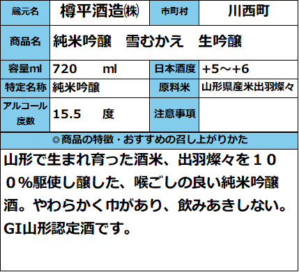 【4月20日発売】純米吟醸 雪むかえ 生吟醸 720ml 販売価格 1,999円(税込み) 会員価格 (税込み) 通常価格 (税込み) 在庫 商品コード 015824 JANコード 数量 - + カートに入れる カテゴリー 清酒 メーカー 樽平酒造㈱ キャンペーン 夏酒 2026| おすすめ商品 RECOMMENDEDおすすめアイテム 【樽平酒造】特別純米生原酒雪むかえ 初しぼり玉庭 720ml 2,139円(税込み) 【樽平酒造】純米大吟醸 雪むかえ 永楽 720ml 2,999円(税込み) 特別純米酒 超辛口 住吉 +10 カップ 180ml 469円(税込み) 樽平酒造 特別純米原酒 極掬粋樽平 720ml 3,500円(税込み) 山形酒通のおすすめ 夏酒 2026 ★イチオシ商品 数量限定商品 お中元-感謝の気持ちを- イタリアワイン おすすめ商品 居酒屋気分ワンカップ パインサイダー 【第30回】山形の地酒 生酒頒布会 産直 厳選グルメ特集 【SALE】訳アリ商品 飲料 雑貨 【新酒】しぼりたて お歳暮-感謝の気持ちを- ご注文方法 送料・配送について お支払い方法 返金について 特定商取引に基づく表記 お問い合わせ 運営会社のご紹介