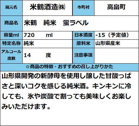 【発売中】米鶴 純米蛍ラベル 720ml 販売価格 1,799円(税込み) 会員価格 (税込み) 通常価格 (税込み) 在庫 商品コード 016382 JANコード 数量 - + カートに入れる カテゴリー 清酒 メーカー 米鶴酒造㈱ キャンペーン 夏酒 2026| おすすめ商品 RECOMMENDEDおすすめアイテム 【発売中】米鶴 爽快辛口 純米生酒 720ml 1,899円(税込み) 【発売中】米鶴 純米生酒 発泡にごり 720ml 1,798円(税込み) 米鶴 純米生酒 発泡にごり 720ml 1,798円(税込み) 【米鶴酒造】米鶴 純米辛口 しぼりたて生 720ml 1,699円(税込み) 【米鶴酒造】米鶴 大吟醸 巨匠 720ml 5,500円(税込み) 山形酒通のおすすめ 夏酒 2026 ★イチオシ商品 数量限定商品 お中元-感謝の気持ちを- イタリアワイン おすすめ商品 居酒屋気分ワンカップ パインサイダー 【第30回】山形の地酒 生酒頒布会 産直 厳選グルメ特集 【SALE】訳アリ商品 飲料 雑貨 【新酒】しぼりたて お歳暮-感謝の気持ちを- ご注文方法 送料・配送について お支払い方法 返金について 特定商取引に基づく表記 お問い合わせ 運営会社のご紹介
