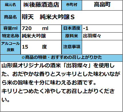 【5月5日発売】弁天 純米大吟醸S 720ml 販売価格 1,980円(税込み) 会員価格 (税込み) 通常価格 (税込み) 在庫 商品コード 416145 JANコード 数量 - + カートに入れる カテゴリー 清酒 メーカー ㈱後藤酒造店 キャンペーン 夏酒 2026| おすすめ商品 RECOMMENDEDおすすめアイテム 辯天(べんてん) 純米大吟醸原酒 出羽燦々35%精米 720ml 4,620円(税込み) 山形酒通のおすすめ 夏酒 2026 ★イチオシ商品 数量限定商品 お中元-感謝の気持ちを- イタリアワイン おすすめ商品 居酒屋気分ワンカップ パインサイダー 【第30回】山形の地酒 生酒頒布会 産直 厳選グルメ特集 【SALE】訳アリ商品 飲料 雑貨 【新酒】しぼりたて お歳暮-感謝の気持ちを- ご注文方法 送料・配送について お支払い方法 返金について 特定商取引に基づく表記 お問い合わせ 運営会社のご紹介