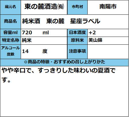 【5月25日発売(予定)】純米酒 東の麓 星座ラベル 720ml 販売価格 1,452円(税込み) 会員価格 (税込み) 通常価格 (税込み) 在庫 商品コード 426207 JANコード 数量 - + カートに入れる カテゴリー 清酒 メーカー 東の麓酒造㈲ キャンペーン 夏酒 2026| おすすめ商品 RECOMMENDEDおすすめアイテム 【東の麓酒造】特別純米酒 あらばしり生酒 720ml 1,633円(税込み) 東の麓 純米吟醸酒 山形セレクション 720ml 1,650円(税込み) 東の麓 純米吟醸酒 山の形(やまのかたち) 720ml 2,035円(税込み) 山形酒通のおすすめ 夏酒 2026 ★イチオシ商品 数量限定商品 お中元-感謝の気持ちを- イタリアワイン おすすめ商品 居酒屋気分ワンカップ パインサイダー 【第30回】山形の地酒 生酒頒布会 産直 厳選グルメ特集 【SALE】訳アリ商品 飲料 雑貨 【新酒】しぼりたて お歳暮-感謝の気持ちを- ご注文方法 送料・配送について お支払い方法 返金について 特定商取引に基づく表記 お問い合わせ 運営会社のご紹介