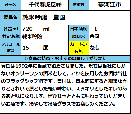 【千代寿虎屋】純米吟醸 豊国 720ml 販売価格 1,870円(税込み) 会員価格 (税込み) 通常価格 (税込み) 在庫 商品コード 010715 JANコード 数量 - + カートに入れる カテゴリー 清酒 メーカー 千代寿虎屋㈱ キャンペーン おすすめ商品 RECOMMENDEDおすすめアイテム 【千代寿虎屋】純米大吟醸 粋晶50 720ml 2,310円(税込み) 【千代寿虎屋】大辛口純米 大虎 720ml 1,430円(税込み) 【イチオシ商品】千代寿 純米吟醸 豊国 720ml 1,870円(税込み) 千代寿 トラちゃんカップ 180ml 308円(税込み) 【千代寿】本格焼酎 虎虎 赤黒セット 720ml×2 2,937円(税込み) 【9月24日発売】2025 月山山麓 新酒 白 720ml 1,617円(税込み) 【11月19日発売】2025 月山山麓 新酒 赤 720ml 1,727円(税込み) 山形酒通のおすすめ 夏酒 2026 ★イチオシ商品 数量限定商品 お中元-感謝の気持ちを- イタリアワイン おすすめ商品 居酒屋気分ワンカップ パインサイダー 【第30回】山形の地酒 生酒頒布会 産直 厳選グルメ特集 【SALE】訳アリ商品 飲料 雑貨 【新酒】しぼりたて お歳暮-感謝の気持ちを- ご注文方法 送料・配送について お支払い方法 返金について 特定商取引に基づく表記 お問い合わせ 運営会社のご紹介