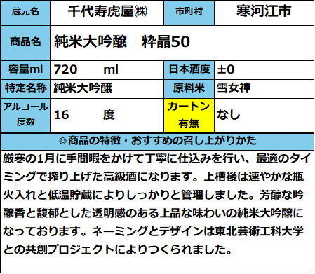 【千代寿虎屋】純米大吟醸 粋晶50 720ml 販売価格 2,310円(税込み) 会員価格 (税込み) 通常価格 (税込み) 在庫 商品コード 010741 JANコード 数量 - + カートに入れる カテゴリー 清酒 メーカー 千代寿虎屋㈱ キャンペーン おすすめ商品 RECOMMENDEDおすすめアイテム 【千代寿虎屋】純米吟醸 豊国 720ml 1,870円(税込み) 【千代寿虎屋】大辛口純米 大虎 720ml 1,430円(税込み) 【イチオシ商品】千代寿 純米吟醸 豊国 720ml 1,870円(税込み) 千代寿 トラちゃんカップ 180ml 308円(税込み) 【千代寿】本格焼酎 虎虎 赤黒セット 720ml×2 2,937円(税込み) 【9月24日発売】2025 月山山麓 新酒 白 720ml 1,617円(税込み) 【11月19日発売】2025 月山山麓 新酒 赤 720ml 1,727円(税込み) 山形酒通のおすすめ 夏酒 2026 ★イチオシ商品 数量限定商品 お中元-感謝の気持ちを- イタリアワイン おすすめ商品 居酒屋気分ワンカップ パインサイダー 【第30回】山形の地酒 生酒頒布会 産直 厳選グルメ特集 【SALE】訳アリ商品 飲料 雑貨 【新酒】しぼりたて お歳暮-感謝の気持ちを- ご注文方法 送料・配送について お支払い方法 返金について 特定商取引に基づく表記 お問い合わせ 運営会社のご紹介