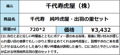 【千代寿】純米吟醸虎屋と出羽の里セット 720ml×2 各決済方法の注意点《銀行振込・郵便振替 決済の場合》◆支払方法でお振込を選択された場合、振込が確認できない場合にはキャンセルとさせていただく場合がございます。◆専用の振込用紙の送付はございませんので、【ご注文確認メール】でご案内する指定の口座にお振込み下さい。◆複数口のご注文で、支払方法がお振込みの場合は全てのご注文金額の合計でご入金を頂けます。◆振込み手数料はお客様のご負担でお願いいたします。《クレジット 決済の場合》◆商品発送は7月下旬以降を予定しておりますが、当システムの都合上、即日決済処理となります。但し、ご注文締め切り日までキャンセルは可能です。その際はクレジット会社の決済スケジュールに合わせてキャンセル処理がされますので予めご了承ください。お届け時の注意点商品の入荷によっては、お届けまで1週間~2週間程度かかる場合がございます。ご了承ください。ご注文内容に確認、修正箇所がある場合はメールまた電話にてご案内致します。ご注文時に入力いただく連絡先は、平日10:00~16:00に連絡がとれる連絡先をご入力ください。以上、ご理解の上ご注文ください。 販売価格 3,432円(税込み) 会員価格 (税込み) 通常価格 (税込み) 在庫 商品コード 020717 JANコード 数量 - + カートに入れる カテゴリー 清酒 メーカー 千代寿虎屋株式会社 キャンペーン お歳暮-感謝の気持ちを-| おすすめ商品 注文年齢制限 20歳 ~ 注文手続き画面にて、生年月日を入力いただきます。 販売期間 ~2026/01/31 RECOMMENDEDおすすめアイテム 【千代寿】本格焼酎 虎虎 赤黒セット 720ml×2 2,937円(税込み) 千代寿 トラちゃんカップ 180ml 308円(税込み) 千代寿 純米大吟醸 粋晶50(雪女神) 720ml 2,200円(税込み) 【9月24日発売】2025 月山山麓 新酒 白 720ml 1,617円(税込み) 【11月19日発売】2025 月山山麓 新酒 赤 720ml 1,727円(税込み) 千代寿 菰樽 1.8L 6,600円(税込み) 千代寿 冷やがこい・出羽の里 純米酒セット 720ml×2本 3,377円(税込み) 千代寿 特別純米酒 出羽の里 720ml 1,430円(税込み) 【12月13日発売】特別純米生しぼりたて 千代寿 720ml 1,628円(税込み) 千代寿虎屋 純米吟醸 虎屋 出羽の里セット 720ml×2本 3,432円(税込み) 山形酒通のおすすめ お歳暮-感謝の気持ちを- 山形酒通厳選 セット商品 おすすめ商品 数量限定商品 秋上がり・ひやおろし 県産新酒ワイン 居酒屋気分ワンカップ リキュール・梅酒特集 産直 厳選グルメ特集 パインサイダー 県内飲料 雑貨 お中元-感謝の気持ちを- 夏酒 2025 ご注文方法 送料・配送について お支払い方法 返金について 特定商取引に基づく表記 お問い合わせ 運営会社のご紹介