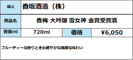 【香坂酒造】雪女神大吟醸 香梅金賞受賞酒 720ml 各決済方法の注意点《銀行振込・郵便振替 決済の場合》◆支払方法でお振込を選択された場合、振込が確認できない場合にはキャンセルとさせていただく場合がございます。◆専用の振込用紙の送付はございませんので、【ご注文確認メール】でご案内する指定の口座にお振込み下さい。◆複数口のご注文で、支払方法がお振込みの場合は全てのご注文金額の合計でご入金を頂けます。◆振込み手数料はお客様のご負担でお願いいたします。《クレジット 決済の場合》◆商品発送は7月下旬以降を予定しておりますが、当システムの都合上、即日決済処理となります。但し、ご注文締め切り日までキャンセルは可能です。その際はクレジット会社の決済スケジュールに合わせてキャンセル処理がされますので予めご了承ください。お届け時の注意点商品の入荷によっては、お届けまで1週間~2週間程度かかる場合がございます。ご了承ください。ご注文内容に確認、修正箇所がある場合はメールまた電話にてご案内致します。ご注文時に入力いただく連絡先は、平日10:00~16:00に連絡がとれる連絡先をご入力ください。以上、ご理解の上ご注文ください。 販売価格 6,050円(税込み) 会員価格 (税込み) 通常価格 (税込み) 在庫 商品コード 015179 JANコード 数量 - + カートに入れる カテゴリー 清酒 メーカー 香坂酒造株式会社 キャンペーン お歳暮-感謝の気持ちを-| おすすめ商品 注文年齢制限 20歳 ~ 注文手続き画面にて、生年月日を入力いただきます。 販売期間 ~2026/01/31 RECOMMENDEDおすすめアイテム 香梅 精撰 カップ 180ml 308円(税込み) 山形酒通のおすすめ お歳暮-感謝の気持ちを- 山形酒通厳選 セット商品 おすすめ商品 数量限定商品 秋上がり・ひやおろし 県産新酒ワイン 居酒屋気分ワンカップ リキュール・梅酒特集 産直 厳選グルメ特集 パインサイダー 県内飲料 雑貨 お中元-感謝の気持ちを- 夏酒 2025 ご注文方法 送料・配送について お支払い方法 返金について 特定商取引に基づく表記 お問い合わせ 運営会社のご紹介