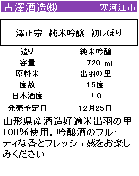 【古澤酒造】澤正宗 純米吟醸初しぼり 720ml 販売価格 1,760円(税込み) 会員価格 (税込み) 通常価格 (税込み) 在庫 商品コード 020834 JANコード 数量 - + カートに入れる カテゴリー 清酒 メーカー 古澤酒造株式会社 キャンペーン 【新酒】しぼりたて| おすすめ商品 注文年齢制限 20歳 ~ 注文手続き画面にて、生年月日を入力いただきます。 RECOMMENDEDおすすめアイテム ★純米大吟醸 山形讃香しずく取り(澤正宗) 720ml【クール便発送】 11,000円(税込み) ★純米大吟醸 山形讃香(澤正宗) 720ml【クール便発送】 7,700円(税込み) 【古澤酒造】澤正宗 酔吟 吟醸酒 720ml 1,870円(税込み) 【古澤酒造】雪原 山形米焼酎『つや姫・雪若丸』セット 720ml×2本 4,609円(税込み) 澤正宗 純米酒 カップ 200ml 440円(税込み) 澤正宗 ヤングカップ 200ml 418円(税込み) 澤正宗 純米大吟醸 紅花屋重兵衛 雪女神 720ml 3,850円(税込み) 澤正宗 酔吟 純米吟醸 720ml 1,650円(税込み) 澤正宗 おもしろ倶楽部 山形の梅酒 500ml 1,320円(税込み) 澤正宗 おもしろ倶楽部 山形のしそ梅酒 500ml 1,320円(税込み) 古澤酒造 雪原 極上米焼酎とそば焼酎セット(720ml×2本) 4,356円(税込み) 【古澤酒造】雪原 山形米焼酎つや姫(カートン入) 720ml 2,244円(税込み) 澤正宗 純米吟醸出羽の里 山形セレクション認定 720ml 1,705円(税込み) 雪原 そば焼酎 720ml 2,145円(税込み) 【古澤酒造】雪原 山形米焼酎つや姫 720ml 1,980円(税込み) 澤正宗 吟醸出羽の里 720ml 1,430円(税込み) 山形酒通のおすすめ お歳暮-感謝の気持ちを- 【新酒】しぼりたて 数量限定商品 おすすめ商品 居酒屋気分ワンカップ 【特設】ご愛飲感謝キャンペーン 産直 厳選グルメ特集 パインサイダー 県内飲料 雑貨 お中元-感謝の気持ちを- ご注文方法 送料・配送について お支払い方法 返金について 特定商取引に基づく表記 お問い合わせ 運営会社のご紹介