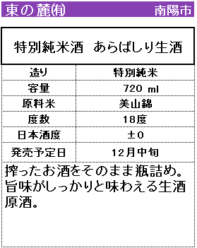 【東の麓酒造】特別純米酒 あらばしり生酒 720ml