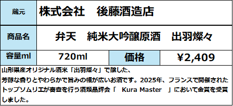 【後藤酒造店】 弁天 純米大吟醸原酒 出羽燦々 720ml 各決済方法の注意点《銀行振込・郵便振替 決済の場合》◆支払方法でお振込を選択された場合、振込が確認できない場合にはキャンセルとさせていただく場合がございます。◆専用の振込用紙の送付はございませんので、【ご注文確認メール】でご案内する指定の口座にお振込み下さい。◆複数口のご注文で、支払方法がお振込みの場合は全てのご注文金額の合計でご入金を頂けます。◆振込み手数料はお客様のご負担でお願いいたします。《クレジット 決済の場合》◆商品発送は7月下旬以降を予定しておりますが、当システムの都合上、即日決済処理となります。但し、ご注文締め切り日までキャンセルは可能です。その際はクレジット会社の決済スケジュールに合わせてキャンセル処理がされますので予めご了承ください。お届け時の注意点商品の入荷によっては、お届けまで1週間~2週間程度かかる場合がございます。ご了承ください。ご注文内容に確認、修正箇所がある場合はメールまた電話にてご案内致します。ご注文時に入力いただく連絡先は、平日10:00~16:00に連絡がとれる連絡先をご入力ください。以上、ご理解の上ご注文ください。 販売価格 2,409円(税込み) 会員価格 (税込み) 通常価格 (税込み) 在庫 商品コード 016198 JANコード 数量 - + カートに入れる カテゴリー 清酒 メーカー 株式会社後藤酒造店 キャンペーン お歳暮-感謝の気持ちを-| おすすめ商品 注文年齢制限 20歳 ~ 注文手続き画面にて、生年月日を入力いただきます。 販売期間 ~2026/01/31 ・酒質 純米大吟醸・アルコール 17度・日本酒度 -0.5~+0.5・酸度 1.6~1.7・原料米 雪女神 RECOMMENDEDおすすめアイテム 辯天(べんてん) 純米大吟醸原酒 出羽燦々35%精米 720ml 4,620円(税込み) 辯天(べんてん) 純米大吟醸原酒 出羽燦々 720ml 2,409円(税込み) 山形酒通のおすすめ お歳暮-感謝の気持ちを- 山形酒通厳選 セット商品 おすすめ商品 数量限定商品 秋上がり・ひやおろし 県産新酒ワイン 居酒屋気分ワンカップ リキュール・梅酒特集 産直 厳選グルメ特集 パインサイダー 県内飲料 雑貨 お中元-感謝の気持ちを- 夏酒 2025 ご注文方法 送料・配送について お支払い方法 返金について 特定商取引に基づく表記 お問い合わせ 運営会社のご紹介