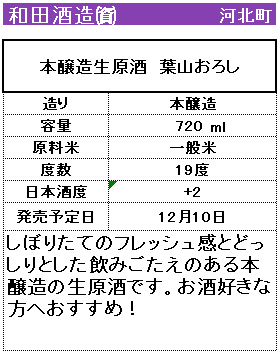 【和田酒造】本醸造生原酒 葉山おろし 720ml 販売価格 1,485円(税込み) 会員価格 (税込み) 通常価格 (税込み) 在庫 商品コード 020914 JANコード 数量 - + カートに入れる カテゴリー 清酒 メーカー 和田酒造合資会社 キャンペーン 【新酒】しぼりたて| おすすめ商品 注文年齢制限 20歳 ~ 注文手続き画面にて、生年月日を入力いただきます。 RECOMMENDEDおすすめアイテム 【和田酒造】ゆぎにごり 純米吟醸生酒ぼんだら 720ml 1,870円(税込み) 【和田酒造】純米吟醸生酒 谷地のあらばしり 720ml 1,980円(税込み) 【和田酒造】出羽の里 純米生原酒あら玉 720ml 1,650円(税込み) 【和田酒造】改良信交 純米吟醸生原酒あら玉 720ml 1,760円(税込み) 【和田酒造】出羽の里 純米吟醸原酒 あら玉限定品 720ml 1,870円(税込み) 【和田酒造】あら玉 大吟醸 月山丸 720ml 5,500円(税込み) あら玉 特別純米 本造り原酒 谷地男 720ml(箱入り) 1,870円(税込み) 和田酒造 あら玉 飲み比べセット 300ml×5本+お猪口2個付き! 4,180円(税込み) あら玉 激辛口 三年熟成本醸造原酒 鬼王丸(赤) 720ml 1,430円(税込み) あら玉 1999年醸造 特別純米 玉彦 720ml 3,465円(税込み) 改良信交 純米大吟醸 あら玉 720ml 3,245円(税込み) 改良信交 特別純米 あら玉 720ml 1,430円(税込み) あら玉 超辛口 純米酒 鬼王丸(青)720ml 1,320円(税込み) 山形酒通のおすすめ お歳暮-感謝の気持ちを- 【新酒】しぼりたて 数量限定商品 おすすめ商品 居酒屋気分ワンカップ 【特設】ご愛飲感謝キャンペーン 産直 厳選グルメ特集 パインサイダー 県内飲料 雑貨 お中元-感謝の気持ちを- ご注文方法 送料・配送について お支払い方法 返金について 特定商取引に基づく表記 お問い合わせ 運営会社のご紹介