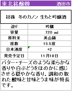 【東北銘醸】初孫 冬のカノン 生もと吟醸酒 720ml 販売価格 1,595円(税込み) 会員価格 (税込み) 通常価格 (税込み) 在庫 商品コード 412035 JANコード 数量 - + カートに入れる カテゴリー 清酒 メーカー 東北銘醸株式会社 キャンペーン 【新酒】しぼりたて| おすすめ商品 注文年齢制限 20歳 ~ 注文手続き画面にて、生年月日を入力いただきます。 RECOMMENDEDおすすめアイテム 【東北銘醸】初孫 純米吟醸しぼりたて 寒すばる 720ml 1,595円(税込み) 【東北銘醸】初孫 出羽燦々しぼりたて純大吟 720ml 1,760円(税込み) 【東北銘醸】初孫 生酛純大吟(限定酒) 720ml 1,925円(税込み) 【東北銘醸】初孫 発泡性にごり純米 しゅわしゅわでDew(でゅー) 500ml×6 7,260円(税込み) 【東北銘醸】初孫 南天魔斬セット 720ml×2 3,740円(税込み) 初孫 酔恋花 500ml×6本 4,224円(税込み) 初孫 魔斬純米本辛口 720ml 1,540円(税込み) 初孫 酒王 マイカップ 180ml 297円(税込み) 初孫 カップ純米酒 180ml 374円(税込み) 初孫 本撰 ニューカップ 180ml 324円(税込み) 初孫 伝承生もと 720ml 1,265円(税込み) 【11月22日発売】初孫 冬のカノン 吟醸酒 720ml 1,430円(税込み) 【11月22日発売】初孫 純米吟醸しぼりたて 寒すばる 720ml 1,430円(税込み) 【12月7日発売】初孫 出羽燦々しぼりたて純大吟 720ml 1,595円(税込み) 初孫 歳時記セット(純米吟醸いなほ・魔斬) 720ml×2本 3,135円(税込み) 初孫 いなほ純米吟醸 720ml 1,595円(税込み) 山形酒通のおすすめ お歳暮-感謝の気持ちを- 【新酒】しぼりたて 数量限定商品 おすすめ商品 居酒屋気分ワンカップ 【特設】ご愛飲感謝キャンペーン 産直 厳選グルメ特集 パインサイダー 県内飲料 雑貨 お中元-感謝の気持ちを- ご注文方法 送料・配送について お支払い方法 返金について 特定商取引に基づく表記 お問い合わせ 運営会社のご紹介