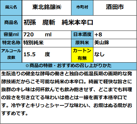 【東北銘醸】初孫 魔斬 純米本辛口 720ml 販売価格 1,540円(税込み) 会員価格 (税込み) 通常価格 (税込み) 在庫 商品コード 022082 JANコード 数量 - + カートに入れる カテゴリー 清酒 メーカー 東北銘醸㈱ キャンペーン おすすめ商品 RECOMMENDEDおすすめアイテム 【東北銘醸】初孫 伝承生もと 720ml 1,265円(税込み) 【東北銘醸】初孫 発泡性にごり純米 しゅわしゅわでDew(でゅー) 500ml×6 7,260円(税込み) 【東北銘醸】初孫 南天魔斬セット 720ml×2 3,740円(税込み) 初孫 酒王 マイカップ 180ml 297円(税込み) 初孫 カップ純米酒 180ml 374円(税込み) 初孫 本撰 ニューカップ 180ml 324円(税込み) 初孫 歳時記セット(純米吟醸いなほ・魔斬) 720ml×2本 3,135円(税込み) 山形酒通のおすすめ 夏酒 2026 ★イチオシ商品 数量限定商品 お中元-感謝の気持ちを- イタリアワイン おすすめ商品 居酒屋気分ワンカップ パインサイダー 【第30回】山形の地酒 生酒頒布会 産直 厳選グルメ特集 【SALE】訳アリ商品 飲料 雑貨 【新酒】しぼりたて お歳暮-感謝の気持ちを- ご注文方法 送料・配送について お支払い方法 返金について 特定商取引に基づく表記 お問い合わせ 運営会社のご紹介